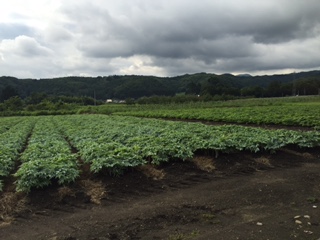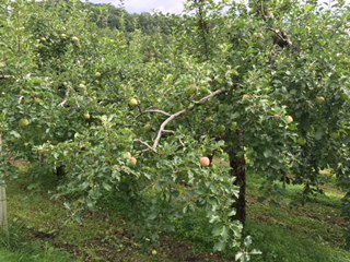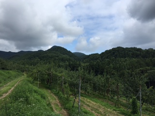 りんご園から見た雨乞山です。今日はいい景色が見えたことでしょう。りんごは少し色付き始めたところです。蒟蒻畑も広がっています!