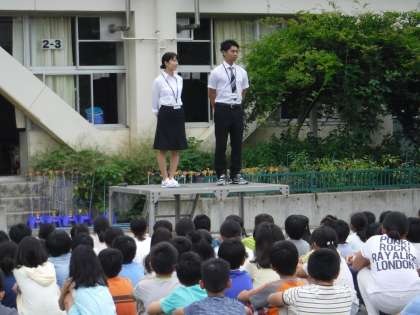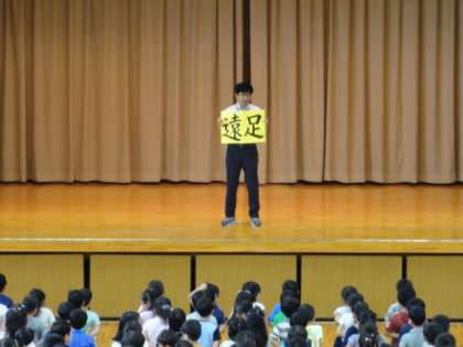 今日の低学年朝会では、校長先生から「遠足」についてお話がありました。体育朝会では、4〜6年生が長なわとびの練習をしました。また、教育実習生の紹介もありました。
