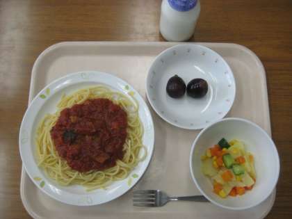 なすとトマトのスパゲッティ 牛乳 マセドアンサラダ 巨峰