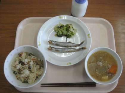 しめじごはん 牛乳 焼きししゃも 野菜の菊花和え 豚汁