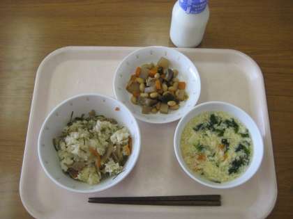 豚肉とごぼうのごはん 牛乳 五目豆 かきたま汁
