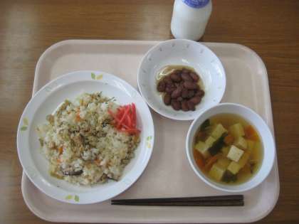 子ぎつねごはん 牛乳 煮豆 すまし汁