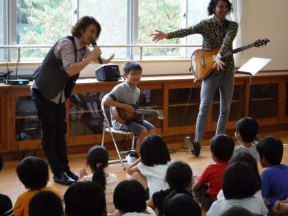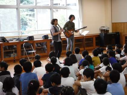 音楽の授業でアーティストのエバリーさんをお招きし、コンサートを行いました。ギターやクラリネットの音色に聞き入ったり、音に合わせて体を動かしたりして、音楽に親しみました。