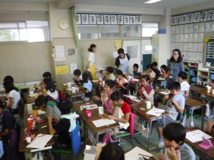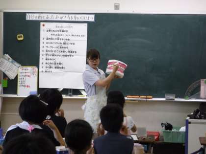 歯科校医さんと歯科衛生士さんに、歯みがき指導を行っていただきました。歯垢を染め出してみがき残しを確認した後、正しいみがき方を教わり練習しました。