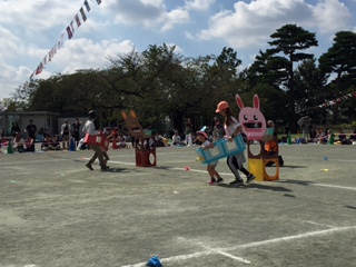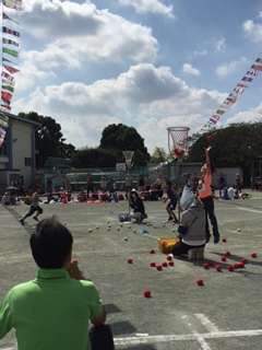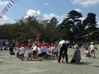 雨のため延期となっていた砧幼稚園の運動会が、素晴らしいお天気のもと行われました。玉入れや親子競技、リレーなど、みんなニコニコしながら走り回っていました。明正小学校に通うお兄さんやお姉さんも、元気に競技に参加していました!