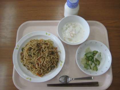 ソースやきそば 牛乳 きゅうりと大根のごま風味 フルーツヨーグルト