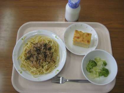おろしスパゲッティ 牛乳 ブロッコリーのサラダ ぐりとぐらのかすてら