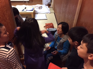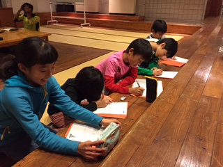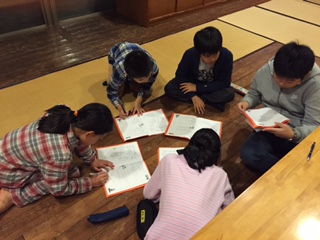 2日目も、そろそろ終わりの時間を迎えました。保健係の人が、部屋のメンバーの検温結果を保健室まで伝えに行きます。大広間では、室長が今日も真剣に話し合いをしていました。おやすみなさい!
