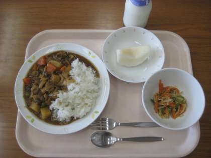 きのこカレーライス 牛乳 ごまドレッシングサラダ 梨
