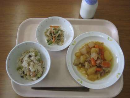まめまめおこわ 牛乳 肉じゃがうま煮 野菜のごまあえ