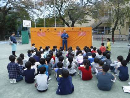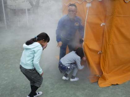 避難訓練の後、煙体験を行いました。煙が充満したハウスの中を通り抜け、視界の悪さや呼吸の苦しさを実際に体験しました。