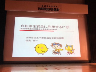 今日の午前中は、成城ホールで、成城警察署管内の地域環境連絡協議会が行われました。自転車の安全利用や犯罪から子どもを守る安全教室についての話をうかがいました。これからの季節、暗くなるのも早くなるため、地域全体で声かけしながら子どもたちの安全を守っていきましょう!