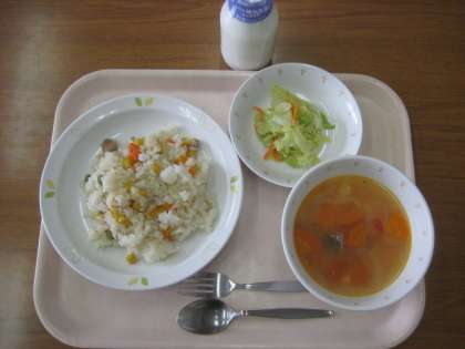 コーンピラフ 牛乳 キャベツサラダ タラのトマトスープ