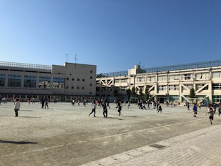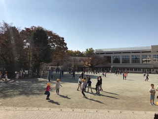 作品展で体育館が使えない中、校庭と屋上に分かれて楽しく遊んでいます。外で遊ぶには最高の天気です!