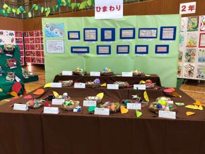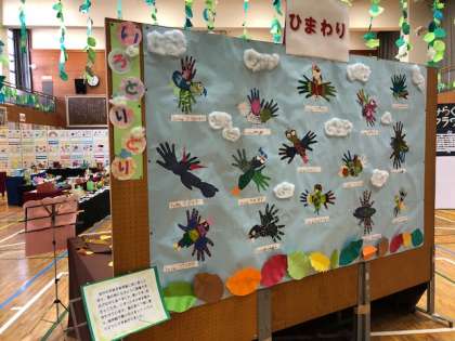 体育館を入るとすぐ、ひまわり学級の作品が展示されています。自分の手形を羽に見立てた鳥、紙粘土で作ったたまご、根気強く取り組んだ刺繍をご覧ください!