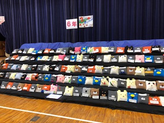 最高学年としての作品展。平面はモノトーンの「ひみつのアトリエ」と自分の心の中を表現した「心マップ」。明正黄金伝説は、話の創作と宝物の表現がマッチしています。家庭科のクッションは、同じ動物でも表情が違うところを味わってみてください!