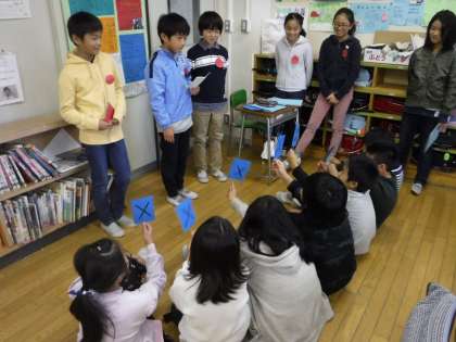 5年生が川場移動教室の様子を4年生に報告しました。雨乞山のハイキングやキャンプファイヤーなど、自分たちが体験したこと・学んだことを分かりやすく伝えていました。報告会の後は、5年生が考えてきたゲームで遊び、親睦を深めました。