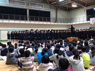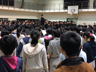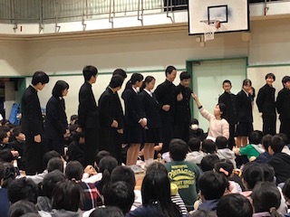各クラスの英語係の生徒たちのスピーチや中学2年生全員による歓迎の歌がありました。最後は、小学生も中学生たちと「夢の世界を」の歌を一緒に歌って砧中学校をあとにしました。あと4ヶ月後の姿をイメージしながら、今できることにしっかり取り組んでいけるといいですね!