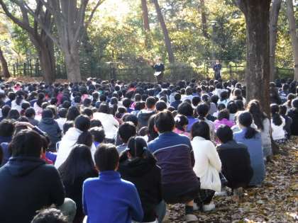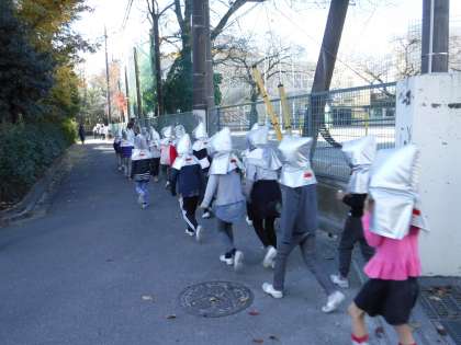 1時間目に、火災発生による二次避難場所への移動を想定した避難訓練を行いました。里山の鉄塔広場まで静かに歩いて避難することができました。