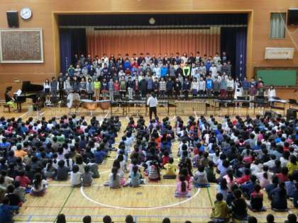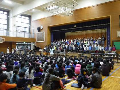 5時間目にウィンターフェスティバルがあり、6年生の合唱と演奏を全校で聴きました。1か月余りの短い練習期間でしたが、朝や休み時間なども使って練習を重ね、その成果を堂々と披露してくれました。学年合唱は「星の世界」と「キセキ」の2曲です。歌声の重なりがとてもきれいでした。