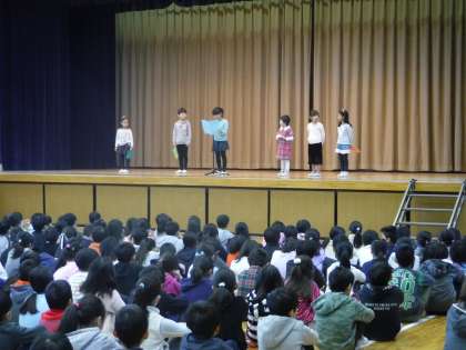 1時間目に終業式が行われ、校長先生から先日行われた駅伝や冬休みについてお話がありました。また、1年生の代表児童が、二学期に頑張ったことを発表してくれました。