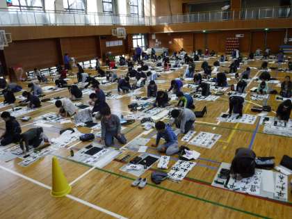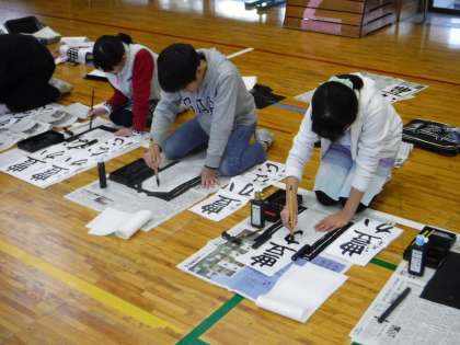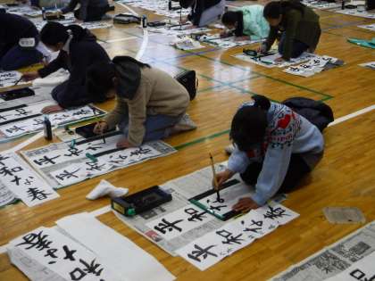 学年ごとに体育館で書き初めの会を行いました。緊張感が漂う中、集中して書き上げていました。