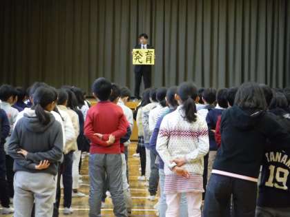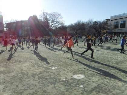 体育朝会では、低学年とひまわり学級が持久走の練習をしました。