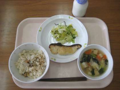 里芋ごはん 牛乳 銀だらのゆずみそ焼き 野菜の菊花和え 吉野汁