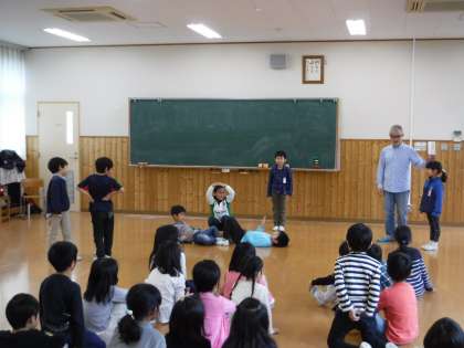 2回目のパブリックシアターを行いました。前回学んだ表現方法を生かして、班ごとに意見を出し合いながら、絵本の一場面を表現しました。