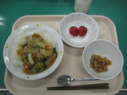中華丼 牛乳 大豆とじゃこの甘辛あげ いちご