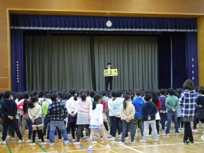 低学年朝会では、校長先生が節分についてのお話をされました。「豆まき」にちなんで、心の中にもいる鬼に打ち勝というというお話でした。