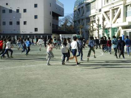 体育朝会では、高学年が校庭で持久走の練習をしました。
