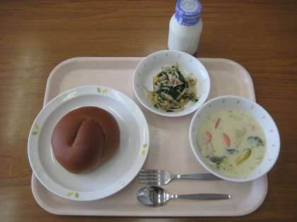 ココアパン 牛乳 さつまいもシチュー ほうれん草サラダ
