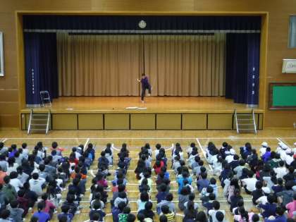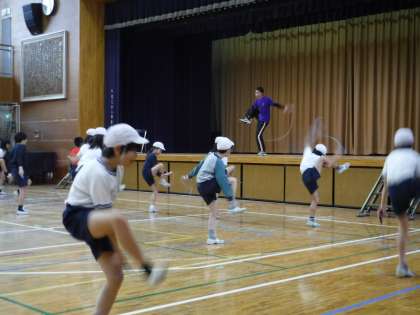 先日に引き続き、オリンピックパラリンピック教育の一環で、なわとびパフォーマーの藤沢祥太郎さんをお招きし、4〜6年生に華麗なパフォーマンスを披露していただきました。5年生は短縄の指導もしていただきました。