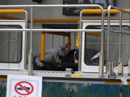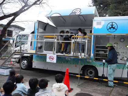 避難訓練の後、起震車で震度7の揺れを体験しました。激しい揺れの中で身を守る方法などを教えていただきました。