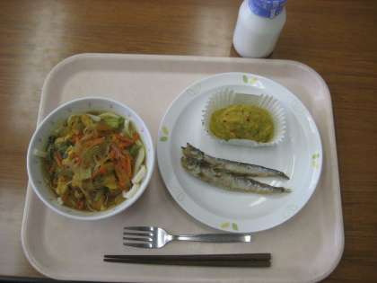 カレーうどん 牛乳 ししゃものからあげ スイートポテト