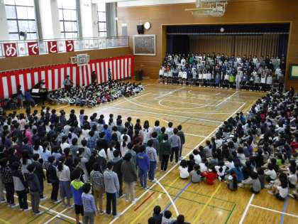 今月は卒業式の歌です。5・6年生合同で「旅立ちの日に」、6年生が「最後のチャイム」を下級生のみんなに向けて歌いました。