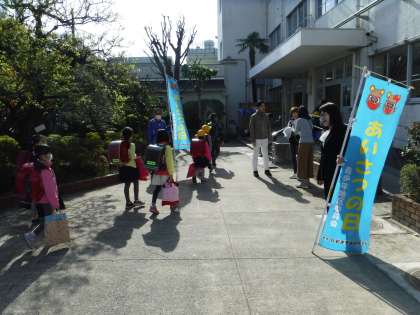 新しい校外班で初登校しました。班長さんを中心に、上級生が下級生の面倒をしっかりと見ていました。