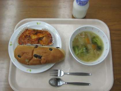 ぶどうパン 牛乳 白身魚のピザ風 白いんげん豆の田舎風スープ