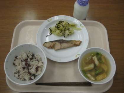 赤飯 牛乳 ぶりの照り焼き きゃべつの塩昆布かけ 吉野汁