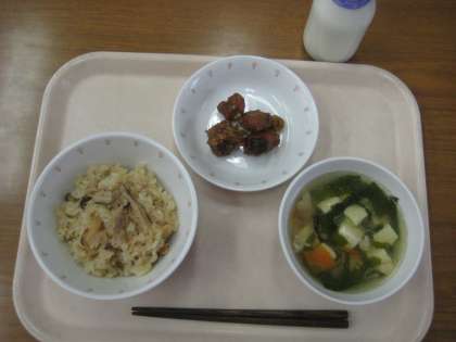 中華おこわ 牛乳 かつおのかりんとうがらめ わかめスープ