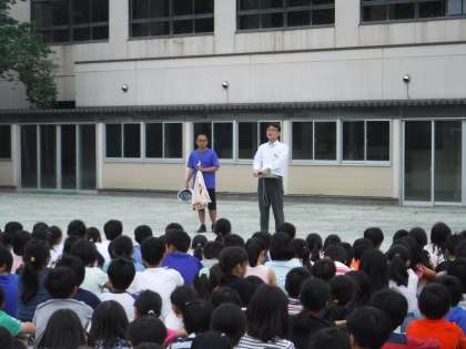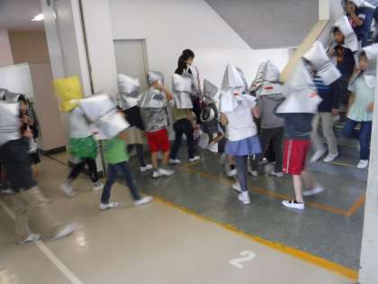 今月の避難訓練は、地震の想定で行いました。机の下にもぐって揺れが収まるのを待った後、防災頭巾を被って校庭に集合しました。