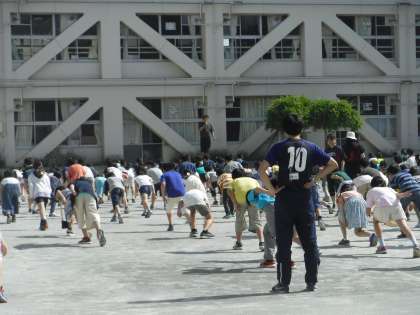 5月の体育朝会では、運動会に向けて、短距離走のスタートの仕方を練習しました。