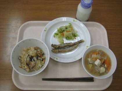 山菜ごはん 牛乳 ししゃものからあげ 即席漬け 根菜汁