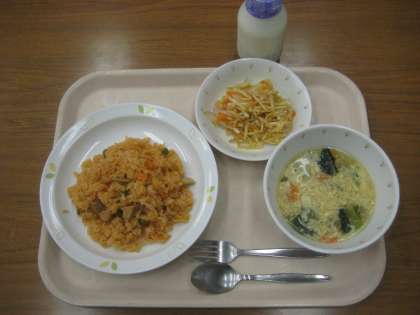 チキンライス 牛乳 じゃがいものフレンチサラダ 卵とチーズのふわふわスープ