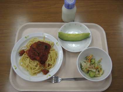 なすとトマトのスパゲッティ 牛乳 ツナサラダ メロン