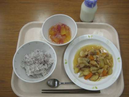 ゆかりごはん 牛乳 五目うま煮 あじさいゼリー
