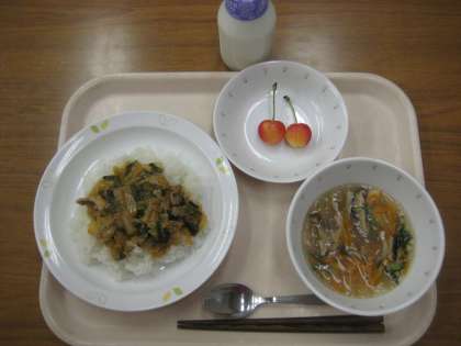 ぶたキムチどん 牛乳 春雨スープ さくらんぼ