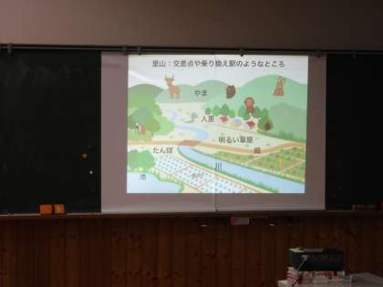 里山コア会議の栗林さん、馬場さん、今田さんを講師にお呼びして、里山講演会を行いました。里山の自然や成り立ちについてお話を伺いました。