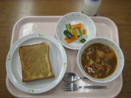 セサミトースト 牛乳 トマトシチュー ピクルス